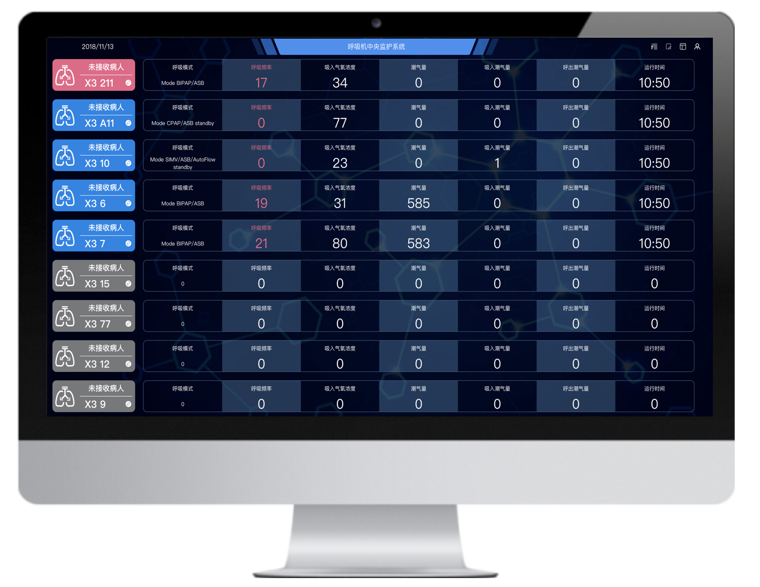 通過的最新的數(shù)據(jù)采集技術(shù)和網(wǎng)絡(luò)技術(shù)將多臺(tái)不同品牌的有創(chuàng)呼吸機(jī)聯(lián)網(wǎng),并通過大屏實(shí)時(shí)集中呈現(xiàn)治療預(yù)設(shè)參數(shù)和監(jiān)測參數(shù),實(shí)現(xiàn)多臺(tái)集中監(jiān)測、集中管理和數(shù)據(jù)存儲(chǔ)。